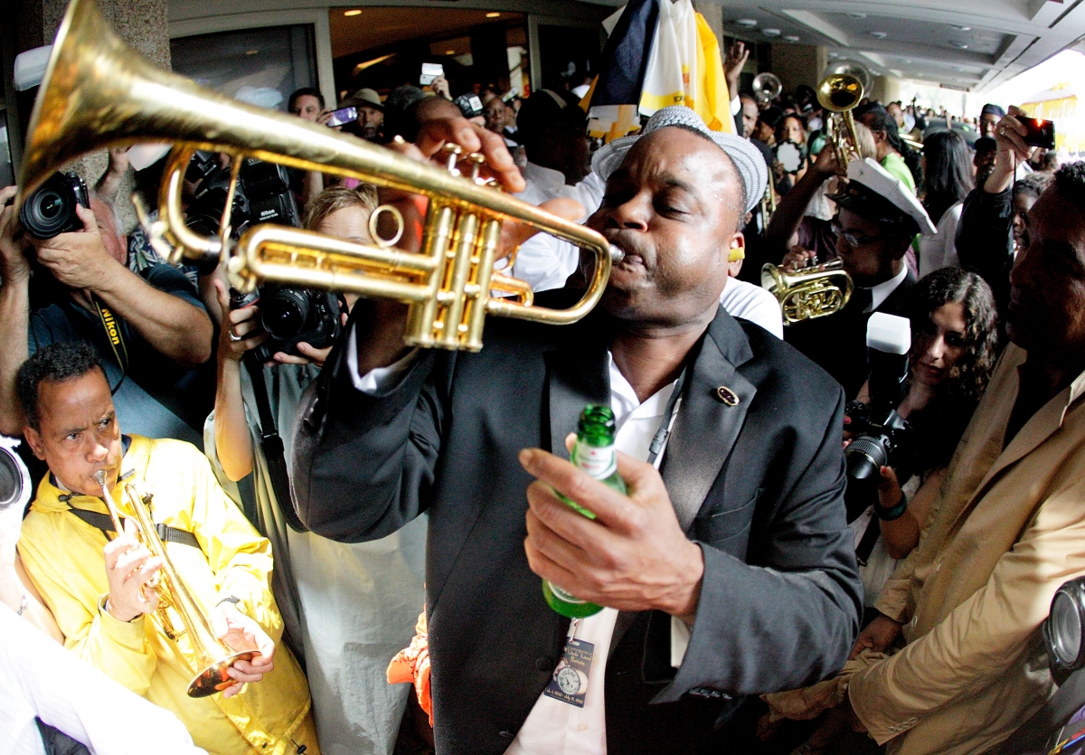 Andrews plays the trumpet during a jazz funeral held for local bass